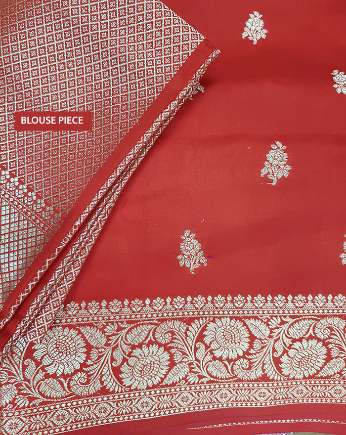 This is a coral-red banarasi saree with golden buttas and a golden zari floral pallu, and a zari ornamental design woven pallu saree that looks very attractive and is best used for any party. This Banarasi Handloom Saree includes a blouse piece for a custom fit.