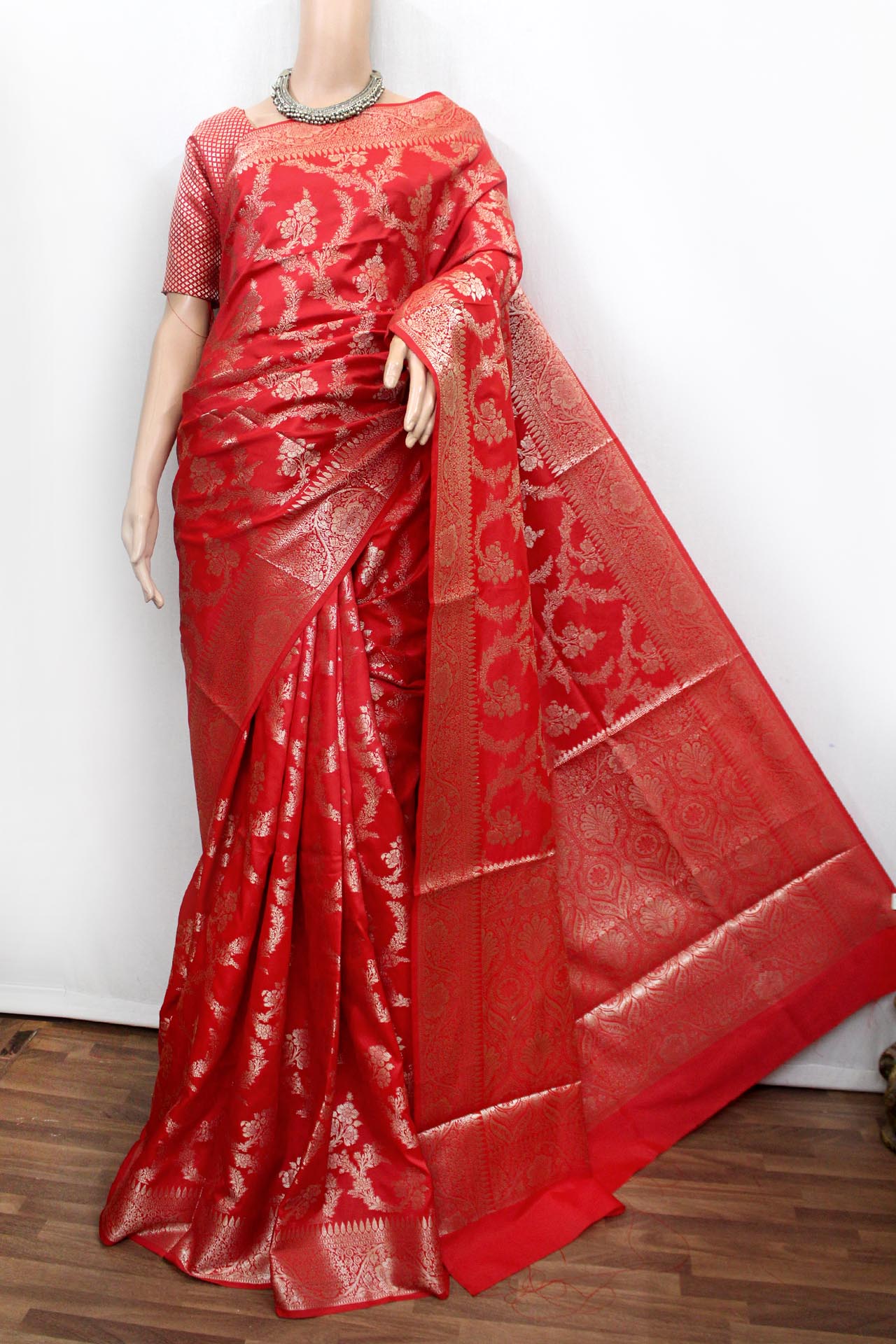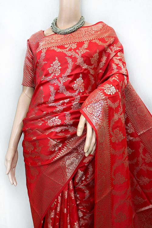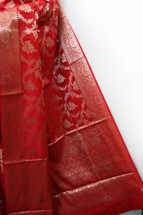 This is a red body with zari floral work all over the saree, along with a beautiful floral zari border and pallu, red Baranasi saree looks very attractive and is best uses for any party or family occasions. This red Banarasi Handloom Saree includes a blouse piece for a custom fit.