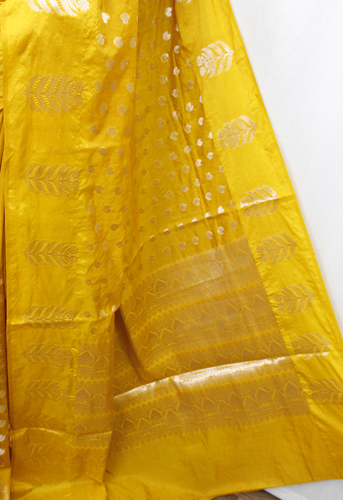 This is a golden yellow banrasi saree with golden leaf buttas and a golden zari floral pallu saree that looks very attractive and is best used for any party. This Yellow Banarasi Handloom Saree includes an unstitched blouse piece for a custom fit.