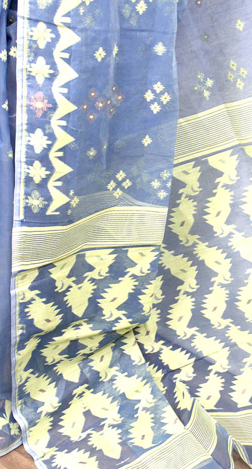 A timeless weave that blends elegance with tradition, this deep sky-blue Jamdani saree is a true masterpiece of handloom artistry. The pristine deep sky-blue Jamdani saree is beautifully adorned with intricate light-yellow and golden Jamdani floral motifs, set against a striking light-yellow leaf motif Jamdani pallu and border, creating a graceful contrast. Lightweight and airy, it drapes effortlessly, making it perfect for festive occasions, cultural events, or traditional gatherings.