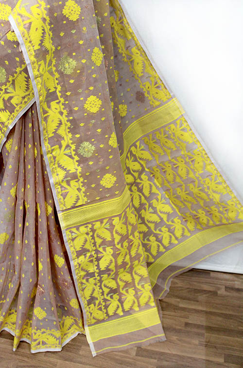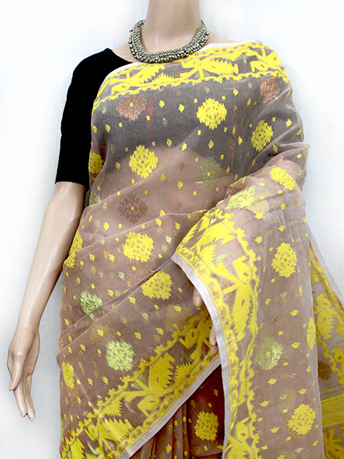 A timeless weave that blends elegance with tradition, this light-brown Jamdani saree is a true masterpiece of handloom artistry. The pristine light-brown base is beautifully adorned with intricate golden, yellow, and copper Jamdani floral motifs, in a striking yellow pallu and border, creating a graceful contrast. Lightweight and airy, it drapes effortlessly, making it perfect for festive occasions, cultural events, or traditional gatherings.