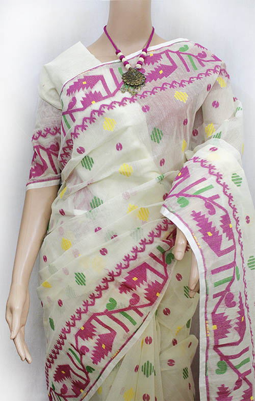 A timeless weave that blends elegance with tradition, this Pink-Off-White Jamdani saree is a true masterpiece of handloom artistry. The pristine Off-White base is beautifully adorned with intricate red, green, and yellow Jamdani butta motifs, in a striking red pallu and border, creating a graceful contrast. Pink-Off-White Jamdani saree is Lightweight and airy; it drapes effortlessly, making it perfect for festive occasions, cultural events, or traditional gatherings.