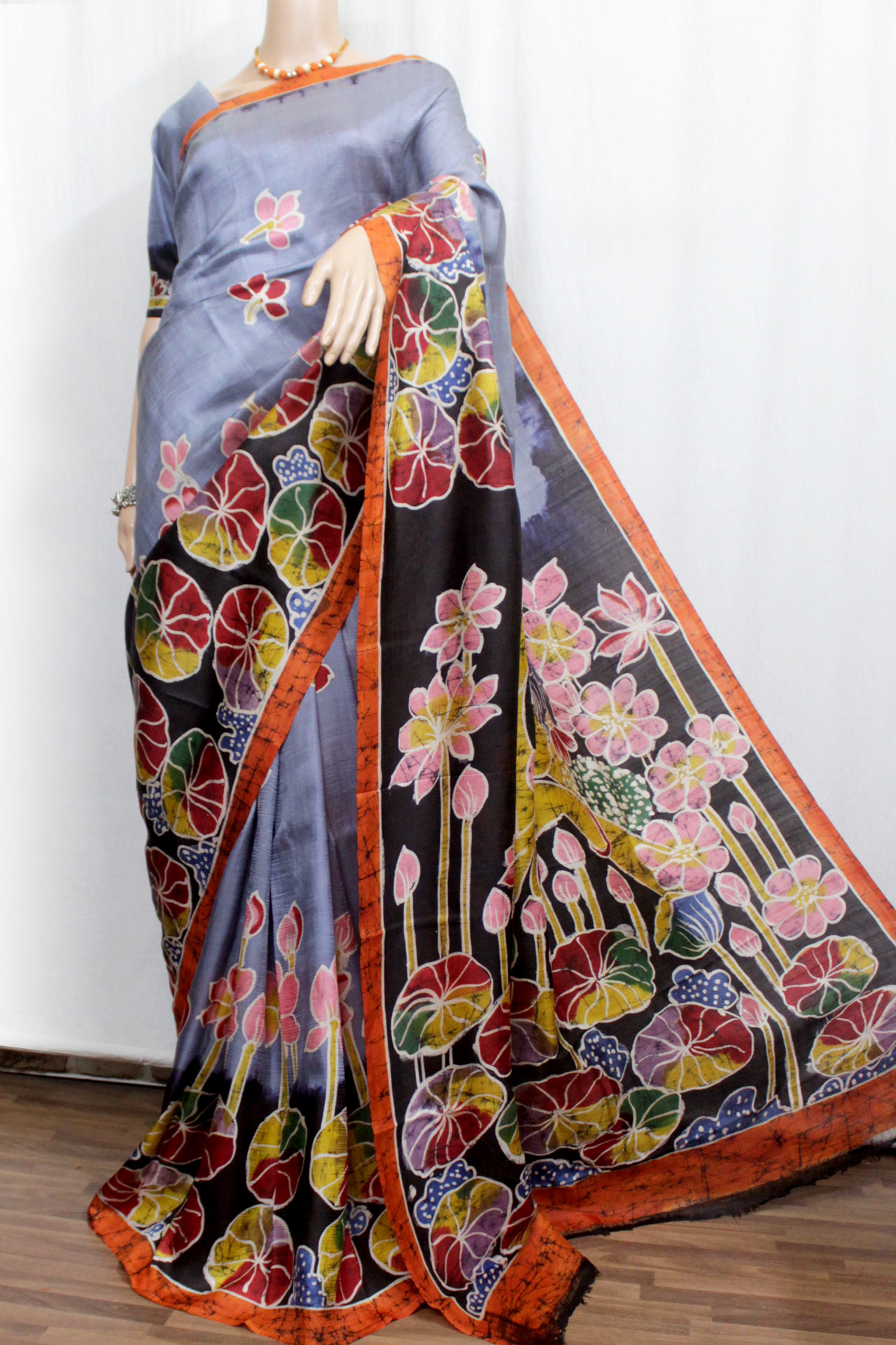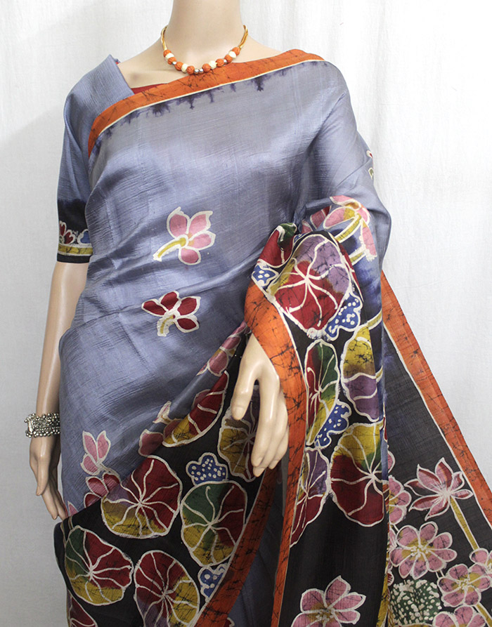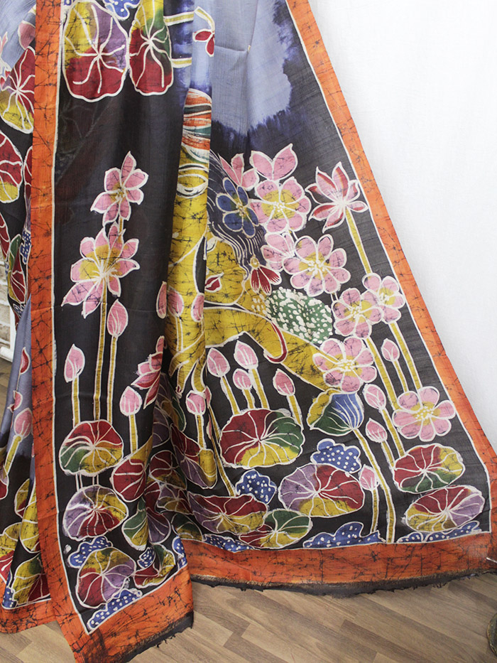 Elegant grey-orange pure silk batik saree with vibrant floral and lotus motifs. Handcrafted with traditional batik dyeing, perfect for festive and cultural occasions.